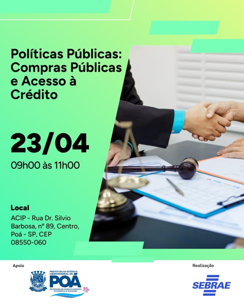 O Sebrae realiza, nesta quarta-feira (23/04), uma palestra gratuita voltada aos microempreendedores individuais (MEIs) sobre o programa Contrata+Brasil, com apoio da Prefeitura da Poá, por meio da Secretaria de Desenvolvimento Econômico e Inovação, e da Associação Comercial e Industrial de Poá (ACIPOÁ).