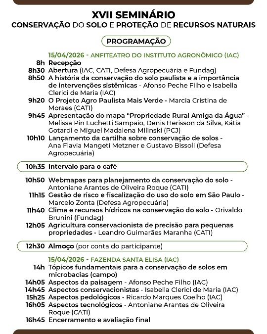 Em comemoração ao Dia Nacional da Conservação do Solo, 15 de abril, será realizado em Campinas (SP) o XVII Seminário sobre Conservação do Solo e Proteção de Recursos Naturais. O evento, que deve contar com a participação de 250 pessoas, está sendo promovido pela Secretaria de Agricultura e Abastecimento do Estado de São Paulo (SAA-SP), por meio da Diretoria de Assistência Técnica Integral (CATI), Diretoria de Pesquisa dos Agronegócios (APTA), Instituto Agronômico (IAC-APTA), Defesa Agropecuária, além da Fundação de Apoio à Pesquisa Agrícola (Fundag).
