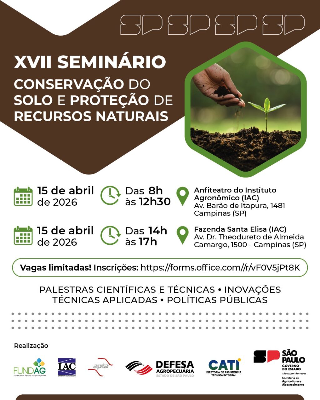 Em comemoração ao Dia Nacional da Conservação do Solo, 15 de abril, será realizado em Campinas (SP) o XVII Seminário sobre Conservação do Solo e Proteção de Recursos Naturais. O evento, que deve contar com a participação de 250 pessoas, está sendo promovido pela Secretaria de Agricultura e Abastecimento do Estado de São Paulo (SAA-SP), por meio da Diretoria de Assistência Técnica Integral (CATI), Diretoria de Pesquisa dos Agronegócios (APTA), Instituto Agronômico (IAC-APTA), Defesa Agropecuária, além da Fundação de Apoio à Pesquisa Agrícola (Fundag).