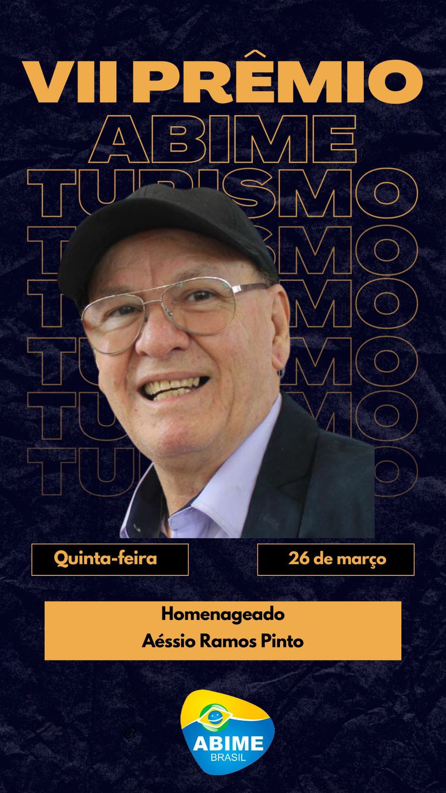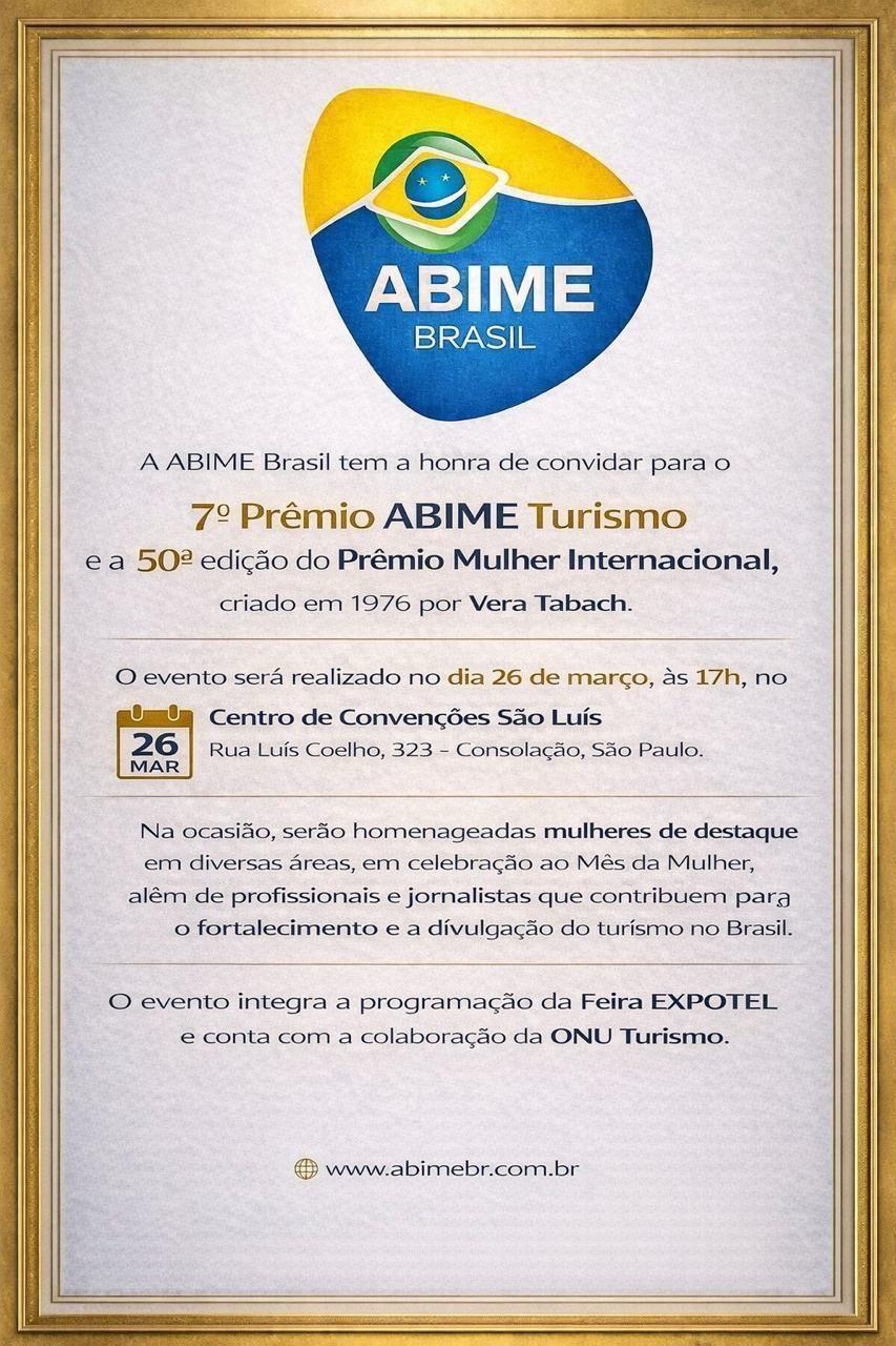 é com imensa alegria que convido vocês para estarem comigo no dia 26 de março, data em que terei a honra de receber o 7º Prêmio ABIME Turismo.